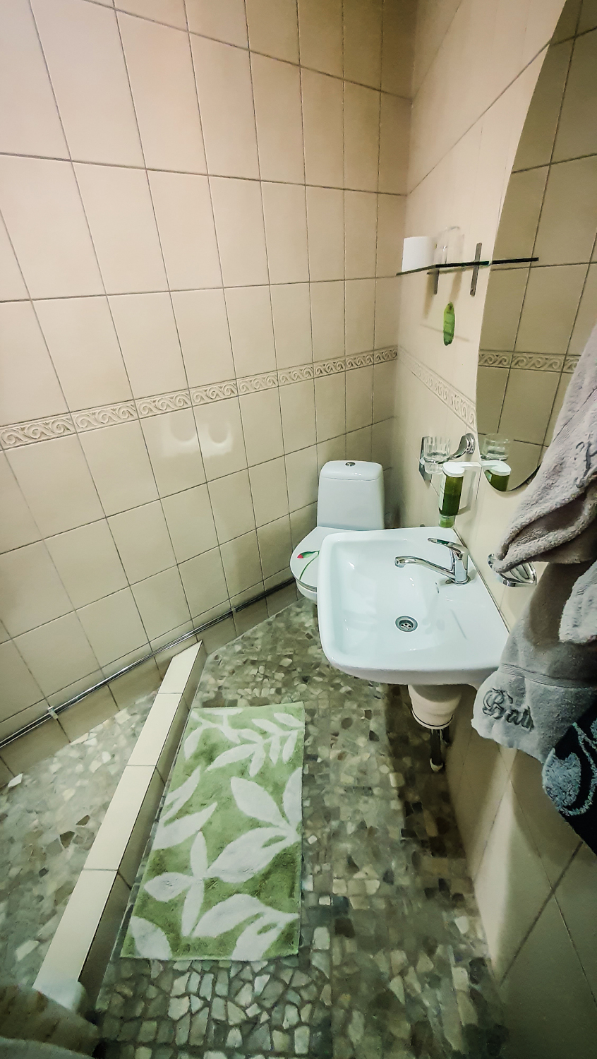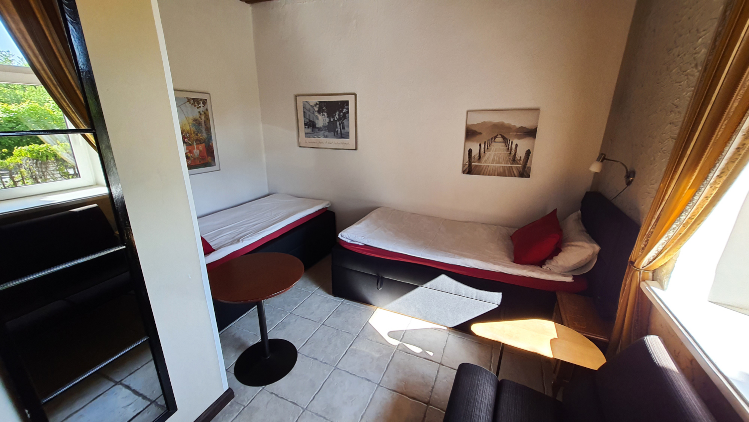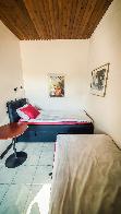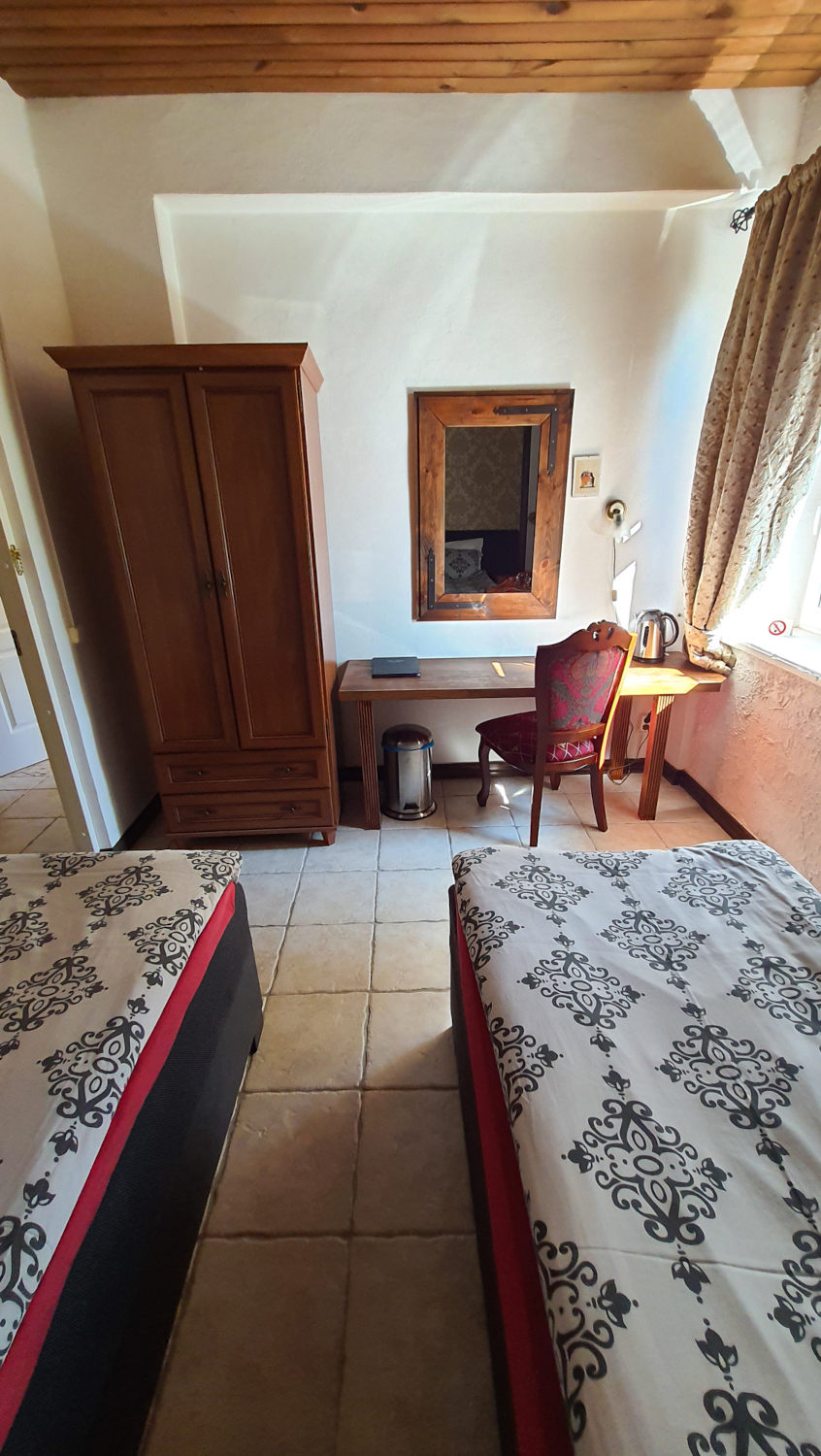 Kolmen hengen huone omalla kylpyhuonella. Huone mukavuudet: Pöytä, Tuoli, Sänky / Sängyt, WC, Suihku, Vedenkeitin, Kahvi ja Tee. Huoneen hintaan sisältyy aamiainen. Pieni jääkaappi.